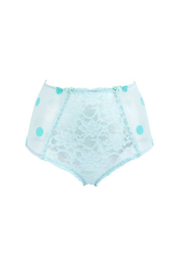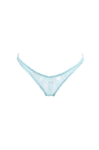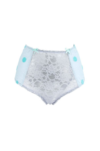 String dentelle grise et coton vert d’eau, et ses petits nœuds pailletés.