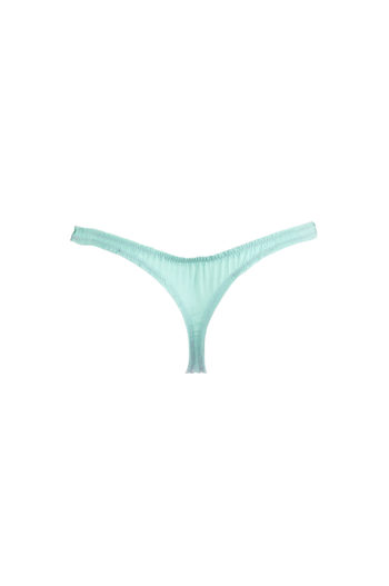 String dentelle grise et coton vert d’eau, et ses petits nœuds pailletés.