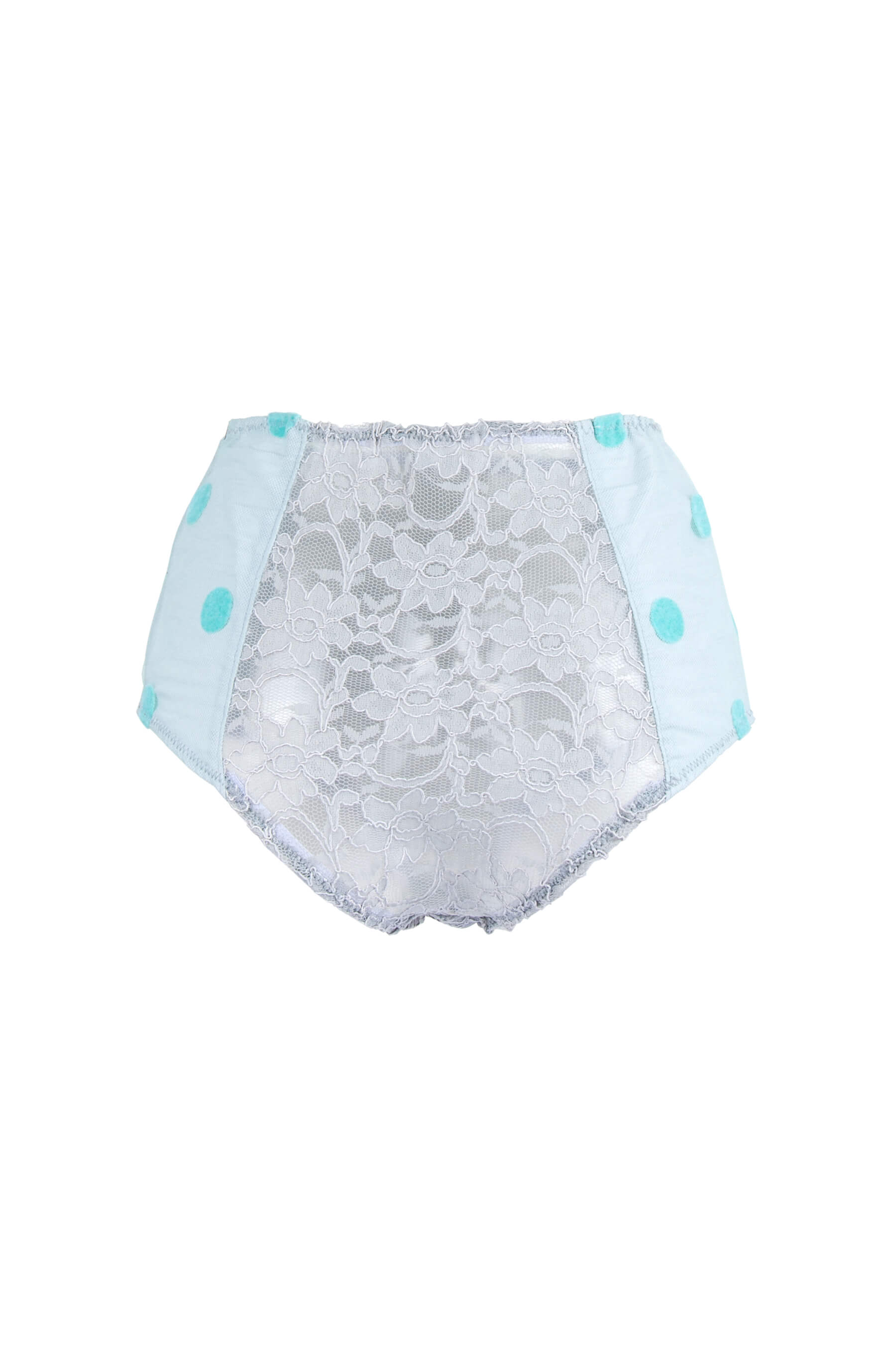 Cette culotte haute en coton et dentelle grise, parsemée de pois de feutrine vert d’eau et de petits nœuds pailletés, vous donnera un côté vintage.